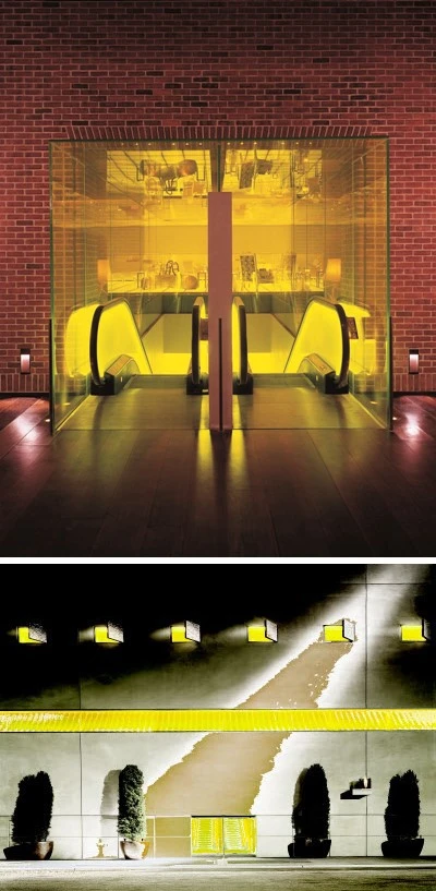흡사 여러 개의 에스컬레이터처럼 보이는 이곳은 사실 하나의 에스컬레이터와 거울이 만들어낸 환상적인 뷰입니다. 황금빛 주황색이 핸드레일을 따라 빛을 밝히고 있습니다.