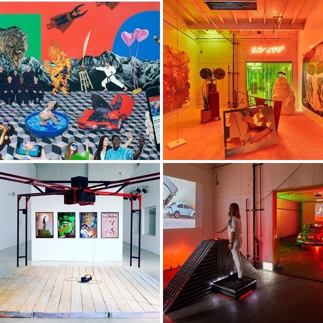 다양한 그래픽 아트, 설치미술, 화분, 회화 등이 자유롭게 전시되어 있습니다.