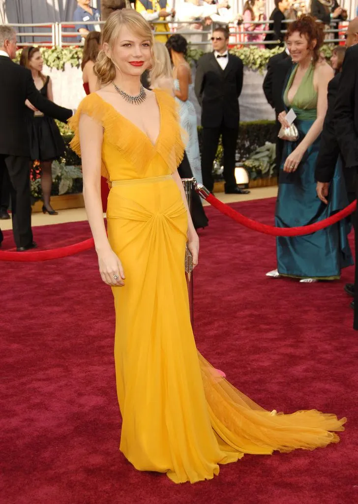 2006년 고운 사프란의 빛깔을 닮은 카나리 옐로우 색상의 베라왕 드레스를 입은 미셸 윌리암스는 레드립을 사용해 레드카펫과 통일성을 주었습니다. 짧은 목걸이와 19세기의 빈티지 반지,그리고 같은 색 계열의 클러치를 들었지만 가장 팬들의 기억에 남는 것은 미셸 윌리엄스의 손을 꼭 잡은 고 히스 레저가 아니었나 생각됩니다.