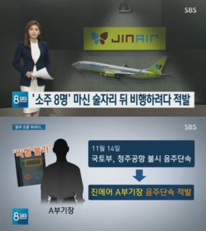 한진그룹에 소속되어 있는 저비용항공사(LCC)인 진에어의 한 부기장은 비행 직전 실시한 음주단속에서 적발되었. 그는 국토부 점검 감독관이 비행 직전 실시한 음주 측정 결과 혈중알코올농도 기준치인 0.02%를 넘어 '비행 불가' 판정을 받았으며 조사 시 "전날 청주에 도착해 저녁 7시부터 11시 20분까지 지인들과 소주 8병을 마셨다"라고 진술했습니다. 하마터면 음주(숙취) 상태의 조종사가 수 백 명의 승객들의 안전에 위협을 가할뻔했습니다.