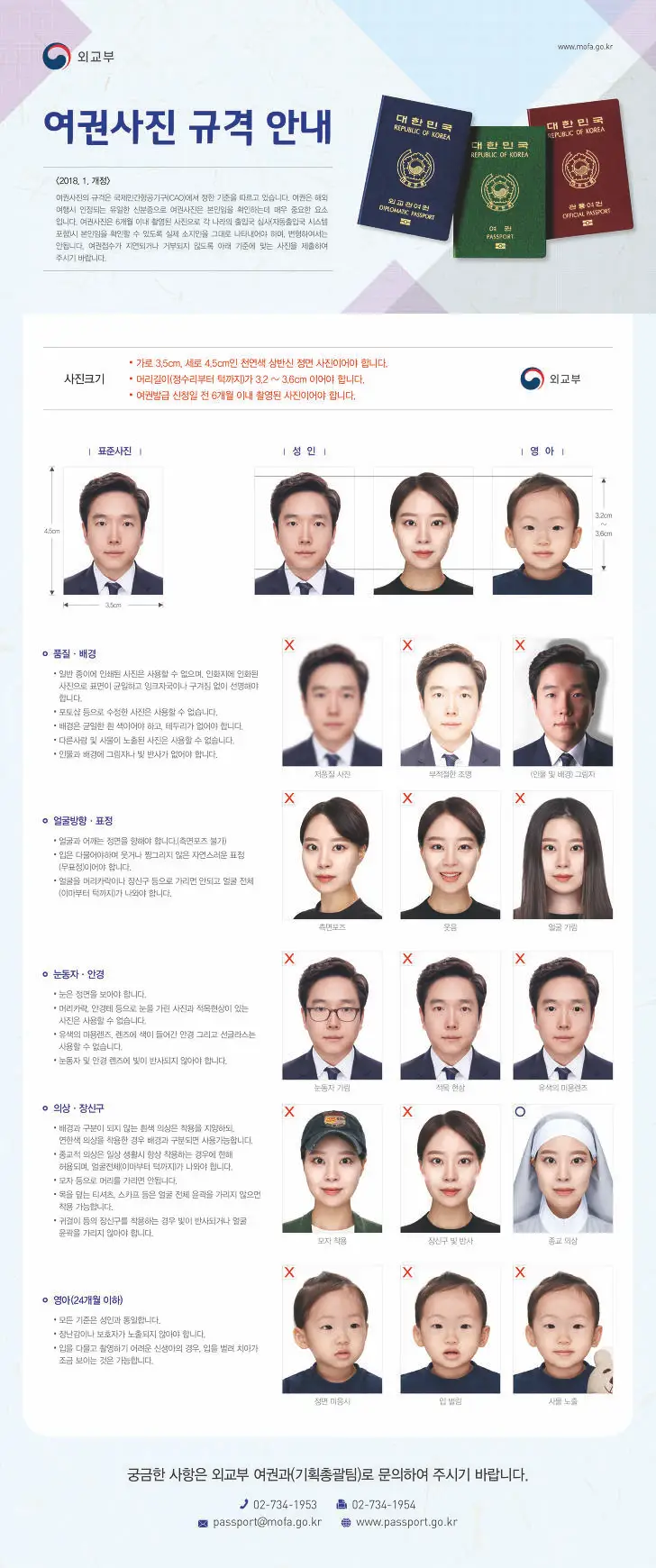 2018년 여권 사진 규정이 일부 개정되면서 △어깨의 수평 유지 △뿔테안경 지양 및 눈썹 가림 △제복과 군복 착용 불가 △두 귀 노출 의무조항 △가발 장신구 착용 지양 등의 항목이 삭제되며 좀 더 자연스러운 사진을 사용해 여권을 만드는 것이 가능해졌습니다. 그러나 바뀐 규정에 대한 잘못된 해석으로 여권 발급이 거부되거나 외교부 여권과로의 문의와 민원이 빗발쳐 외교부에서는 2018년 말, 2019년 초 두 차례에 걸쳐 여권 사진 규격에 대한 자세한 규정을 다시 안내한 바 있습니다.