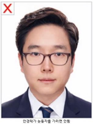 뿔테를 착용하는 것에 관한 규정은 어떨까요? 결론부터 말하자면 '가능'입니다. 안경테가 눈썹을 가린 사진은 사용할 수 있으나, 안경테가 눈을 가린 사진은 사용할 수 없습니다. 또한 사진 촬영 시 발생하는 미세한 안경테 그림자는 무방하나 그 그림자가 눈을 가린다면 사용할 수 없습니다. 그러나 안경테가 지나치게 두꺼운 안경은 출입국시 위 변장으로 오인을 받아 불편을 초래할 수 있으니 가급적 사용하지 않는 것이 좋다고 하네요.