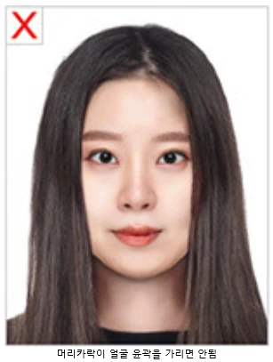 머리카락으로 귀를 가린 사진은 어떨까요? 외교부에 따르면 이러한 사진도 가능하다고 합니다. 단, 귀를 가리는 것은 가능하지만 얼굴 윤곽은 보여야 합니다. 얼굴을 작게 보이게 하기 위해 머리카락으로 몰, 광대 부위 등을 가린 사진은 사용할 수 없겠네요.