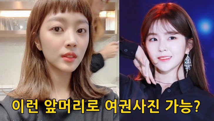 두 번째로는 머리카락이 양쪽 눈썹의 일부를 가리는 경우입니다. 숱이 적은 '시스루뱅', 또는 레드벨벳의 아이린이 유행시킨 '어니언뱅'을 한 사진도 여권 사진으로 활용할 수 있다는 뜻입니다. 단, 머리카락 사이로 양쪽 눈썹의 윤곽 및 형태를 명확히 확인할 수 있어야 한다고 합니다.