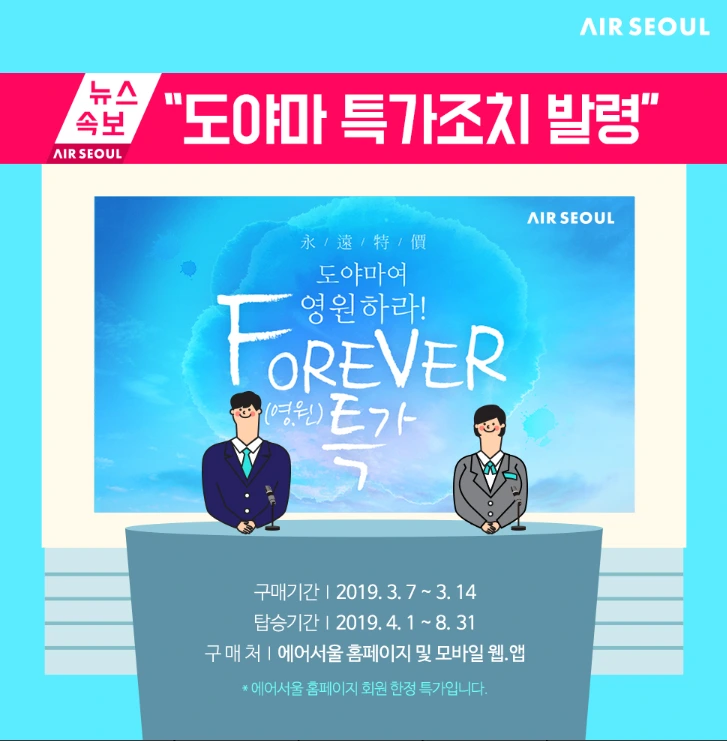 해외여행이 일상화되면서 많은 여행객들이 항공권 가격에 더욱 관심을 가지고 있습니다. 항공사는 많아지고 특가는 쏟아져 나오는데 정리할 시간이 없는 분들을 위해 "특가 항공권! 정리는 내가 해줄게, 넌 한방에 보기만 해!" 2019년 3월 둘째 주 특가 항공권 정보를 준비했습니다. 이번 주는 에어부산의 6월 탑승 얼리버드, 27개 노선 특가인 진에어의 '슬림한진' 그리고 에어서울의 항공운임 0원 특가 등 다양한 노선을 대상으로 프로모션 중입니다. 자세한 내용은 아래를 참고하세요.