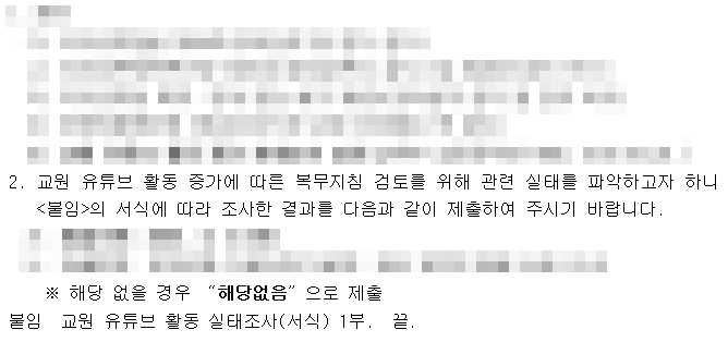 이러한 사회적 논란을 의식하기라도 한듯이 교육부 교원정책과에서는 '교원 유튜브 활동 관련 실태조사'를 전격 실시했습니다. 이 조사에서는 유튜브를 하고 있는 교사의 채널명은 무엇인지, 최초로 채널 개설을 한 것은 언제인지, 구독자 수는 몇 명인지, 동영상의 숫자는 몇 개인지, 동영상의 주요내용은 무엇인지, 광고수익은 얼마인지 등을 매우 구체적이고 소상하게 보고하도록 했습니다. 덧붙여 교원 유튜브 활동 증가에 따른 복무지침을 검토하겠다고 밝혀 교사의 유튜브 활동에 대한 가이드라인을 만들 것을 예고했습니다.