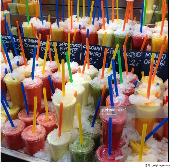 시장 안쪽에는 신선한 과일주스를 파는 곳이 많습니다. 당일 아침에 직접 만들어 얼음에 넣어 놓고 판매하는데, 보통 한 잔에 1.5유로, 두 잔에는 2유로에 팝니다. 이 가격보다 더 낮을 경우 주스가 오래되었을 확률이 있으므로 주의해서 구매해야합니다.