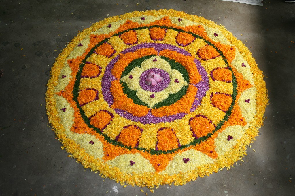 인도 남서단에 있는 주인 케랄라(Kerala)에서는 '오남(Onam)'이라고 불리는 축제가 매년 9월에 행해집니다. 이는 추수감사제의 성격을 가지고 있는 축제인데요 과거 케랄라 지방을 번성하게 했던 마하발리 왕을 기리는 의미를 담고 있으며 이 축제는 열흘간 계속된다고 합니다. 열흘 동안 이 지방의 가정집 앞에는 매일 둥근 꽃 카펫이 만들어집니다. 보통 주황색, 핑크색, 노란색을 많이 사용하며 기하학적 무늬, 꽃무늬 등의 디자인을 사용해 만든다고 하네요.