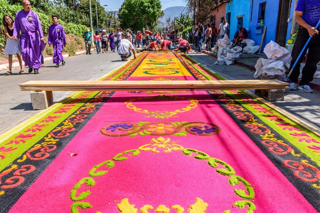 과테말라의 안티구아에서는 부활절 기간 동안 화려한 꽃길이 만들어집니다. 이 꽃길은 꽃만으로 만들어지는 것은 아닙니다. 파인애플과 망고와 같은 과일, 옥수수, 양배추와 같은 채소, 그리고 형형색색 물들여진 톱밥 등이 이 아름다운 꽃길을 만들어지는데 쓰입니다. 이 길은 부활절 전 주에 만들어지며 기하학적 무늬, 새 모양, 꽃 모양, 그리고 종교적인 문양 등이 어우러져 있습니다. 이 꽃길은 자원봉사자들에 의해 매일 다시 만들어집니다. 왜냐하면 이 위로 대형 가톨릭 성인상을 메고 가는 순례행렬이 있기 때문입니다. 이 꽃길은 스페인에서 꽃길을 만들던 전통과 솔잎, 깃털, 꽃 등으로 카펫을 만드는 마야의 전통이 섞인 것입니다. 이 기간 동안에는 교회와 일부 호텔에서도 이러한 장식을 볼 수 있습니다.