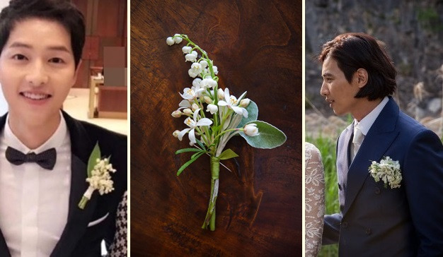 이나영과 결혼한 원빈, 송혜교와 결혼한 송중기 둘 다 이런 스타일의 부토니아로 옷깃을 장식했습니다. 송중기는 은방울꽃을 사용했으며 원빈은 들꽃으로 부토니아를 만들었다고 하네요. 이 두 신랑들은 신부의 부케에 사용된 꽃과 같은 꽃을 사용해 통일감을 줬다고 합니다.