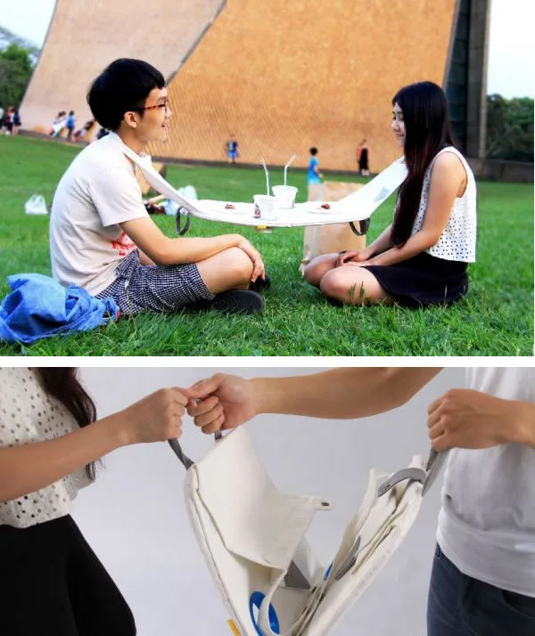 식사 테이블에서 상대에게 좀 더 집중하게 만드는 시도는 이것이 처음이 아닙니다. 마이클 잔이라는 이름의 대만 발명가는 목에 걸어 서로에게 집중하며 식사를 해야 하는 '간이 냅킨 테이블'을 만들어 화제를 모았습니다.