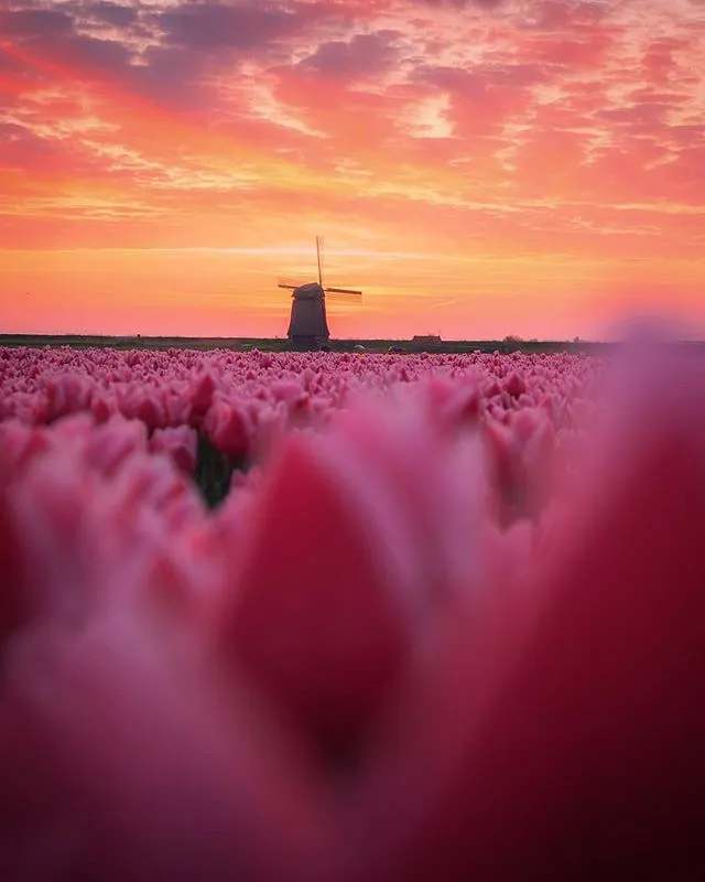 네덜란드를 상징하는 사진이 아닐까 싶은데요. 풍차와 그 앞으로 펼쳐진 튤립 밭이 평화로운 네덜란드 전원의 풍경을 보여줍니다.