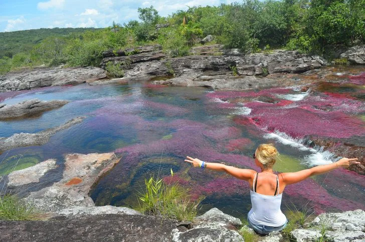 이곳의 강물은 어떻게 이런 색이 나는 걸까요? 바로 이 강물 속에서 자라는 '마카레니아 클라비게라'라는 수생식물이 강바닥에서 서식하고 있는데, 이 식물들이 햇빛에 오색빛깔로 반사되어 비치기 때문이라고 합니다. 이 식물은 강바닥의 바위에 단단하게 부착되어 살고 있는 것으로 알려져 있습니다.