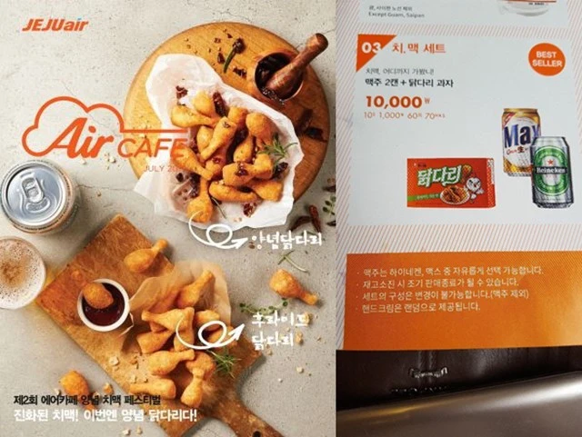 비슷한 일이 우리나라에서도 있었습니다. 바로 제주항공의 '치맥 세트'였는데요. 보통 치맥 세트는 치킨과 맥주를 뜻하는데, 제주항공에서는 치킨 대신에 닭다리 모양의 스낵을 제공한 것이지요. 12,000원에 맥주 두 캔과 스낵으로 이루어진 이 세트는 출시되자마자 논란을 일으켰는데요. '너무 비싸다' '소비자를 기만하는 행위이다' 등의 반응과 함께 '재치 있다' '원래 기내식은 비싸다' 등의 긍정적인 반응도 있었습니다.