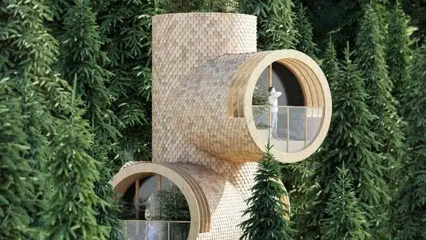 또한 이 트리하우스의 표면은 나뭇잎과 같은 모양으로 되어 있으며, 나무를 소재로 만들어졌기에 자연과 잘 어울린다는 장점이 있습니다.