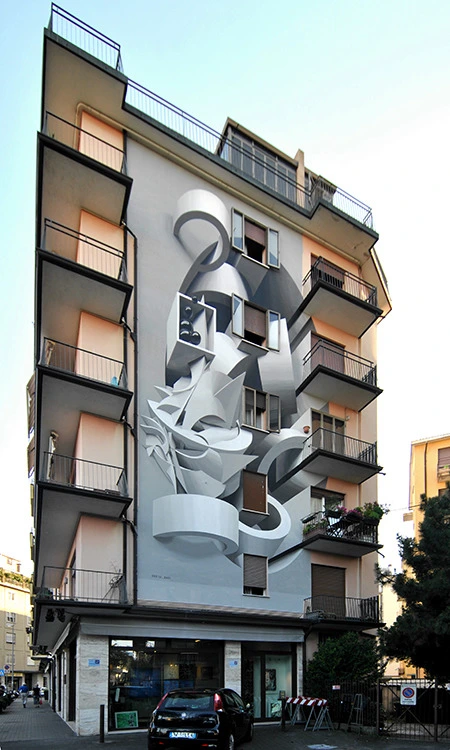 한 벽화가, 혹은 그래피티 예술가가 화제입니다. 그가 손대는 건물마다 곡선으로 휘어지고, 꼬임이 생기는 것인데요. 실제로 이렇게 건물의 모양이 변하는 것은 아니겠죠. 바로 벽화를 통해 착시현상을 주는 것입니다.