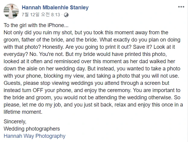 제 사진을 망쳤을 뿐만 아니라 커플의 이 순간도 빼앗아갔네요. 도대체 이 사진으로 뭘 할 예정인가요? 이 사진을 인쇄할 건가요? 아니면 간직할 건가요? 아니면 매일 볼 건가요? 아닐거라 생각해요. 그러나 우리 신부님은 이 사진을 인쇄하고, 간직하고, 매일 볼거에요.