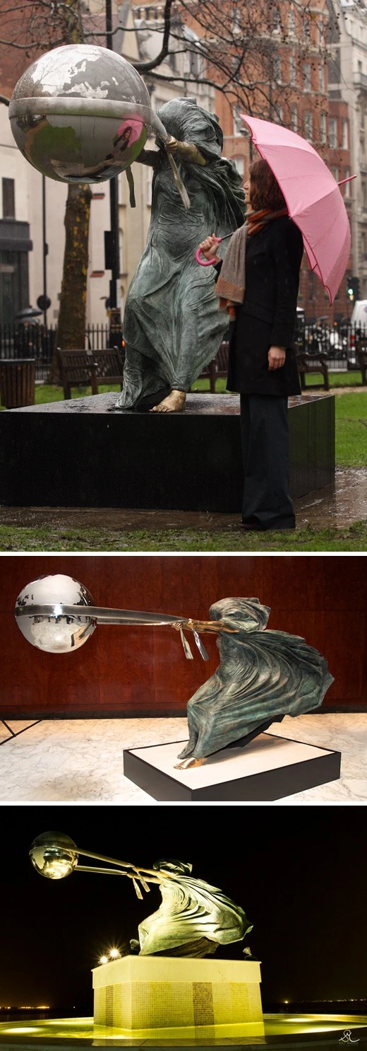 이탈리아 조각가 로렌조 퀸(Lorenzo Quinn)에 의해 만들어진 이 작품은 런던, 뉴욕, 도하(카타르) 등 세계 주요 도시에 설치되어 있습니다. 천으로 둘러싸인 사람은 대자연을 의인화 한 것이며 이 대자연이 지구를 빙빙 돌리거나 어딘가에 던져버리는 것처럼 묘사되어 있습니다. 로렌조 퀸은 전 세계의 허리케인이 인간 삶을 파괴해나가는 것을 보고 이런 작품을 만들었습니다.