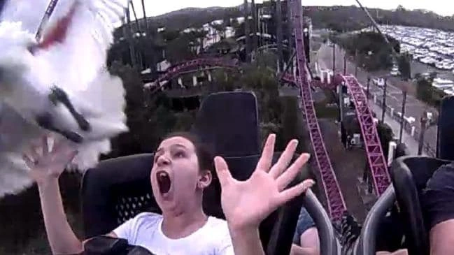 동영상 속에서 조카와 삼촌은 즐겁게 롤러코스터를 타고 있습니다. 별안간 조카의 얼굴에 흰색 털이 있는 무언가가 날아들었는데요. 이것은 따오기과의 거대한 새였습니다. 롤러코스터의 흥분과 함께 새까지 얼굴로 맞은 이 조카는 흥분과 공포를 감추지 못하고 아무말 대잔치를 벌이고 있네요. 삼촌은 동그랗게 눈을 뜨고 조카를 보더니 이내 상황을 파악하고 웃으며 롤러코스터를 타고 있습니다.
