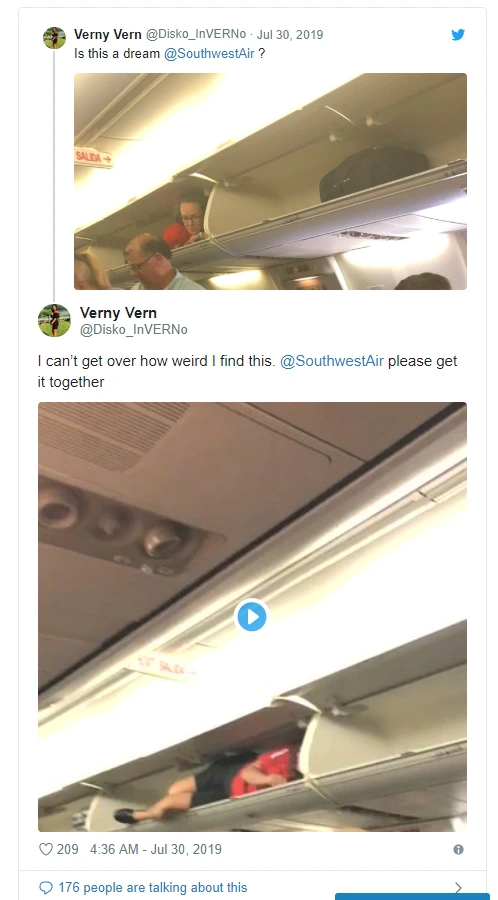 이 동영상과 사진을 공개한 승객인 베로니카 로이드(Veronica Lloyd)에 따르면 이 항공기는 내쉬빌에서 필라델피아로 가는 사우스웨스트로 가는 여정이었으며 승객들이 비행기에 탑승하고 있을 때 거의 10여 분 동안 이 승무원이 선반에 누워있었다고 합니다.