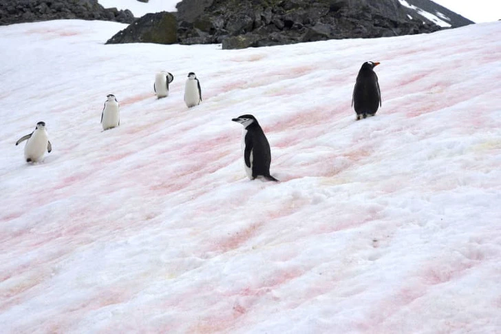 이 붉은색은 바로 클라미도모나스(Chlamydomonas nivalis)라는 미생물에 의해서 만들어지는 것입니다. 이는 녹조 생물의 일종으로, 강렬한 자외선으로부터 스스로를 보호하기 위해 붉은빛을 발산합니다. 이로 인해 이런 광경이 펼쳐지는 것이죠.