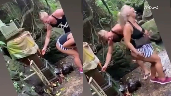 이 동영상에서 이 커플은 발리의 힌두교 사원인 베지 사원(Beji Temple)에 있었습니자. 돌레살로바는 이곳에서 치마를 걷어올려 엉덩이를 들이밀었으며 슬로우커는 엉덩이에 이곳에 있던 물을 두 차례 뿌렸죠. 이 여성은 이내 물이 차가운 듯 박장대소하기도 했습니다. 마치 비데를 하는 듯한 장면을 연출한 것이죠.