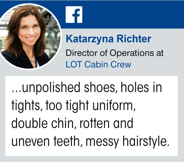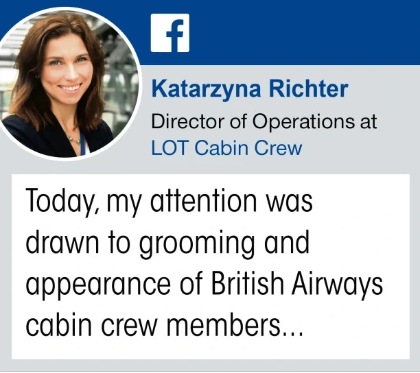 LOT폴란드에어에서 객실승무원 운영 책임자를 맡고 있는 카타르지나 리히터(Katarzyna Richter)는 자신이 몸담고 있는 항공사가 아닌 영국항공을 탑승했습니다. 리히터는 비행 중 영국항공 승무원들을 몰래 촬영했고, 이를 자신의 페이스북에 올리며 이들의 외모에 대해 평가했습니다.