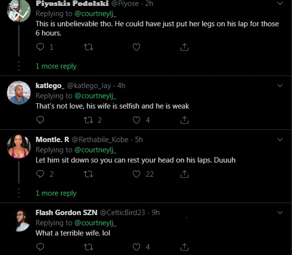 또 다른 의견으로는 이 아내는 누워있어야만 하는 특별한 사정이 있었을 것이라며, 사진 한 장 만으로 이 아내를 비난해선 안된다는 주장도 펼쳤습니다. 한 네티즌은 6시간 내내 서있는데 승무원이 제지하지 않았다는 점도 놀랍다고 말하고 있네요.