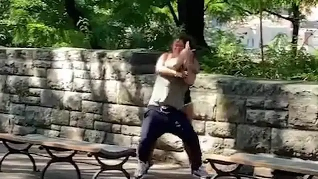 벤치 위에 한 커플이 앉아있습니다. 그리고는 갑자기 여자가 남성의 얼굴로 무언가를 들이미는데요. 때리는 것 같지는 않습니다. 그는 필사적으로 얼굴을 피하고 있는 것처럼 보입니다. 벤치에서 뒤로 넘어갔다 팔로 얼굴을 감싸기도 하고 마치 복싱을 하는 듯 여성의 손을 마구 피하고 있습니다.