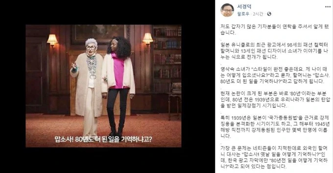 서경덕 성신여대 교수는 이 광고에 대해 '의도된 것'이라고 밝혔습니다. 그러면서 '유니클로는 이제 완전히 돌아올 수 없는 선을 넘었으며 이제는 불매운동을 넘어 퇴출 운동을 펼쳐 나가야 한다'라고 주장하기도 했죠.