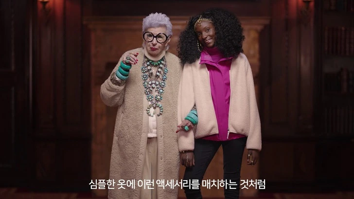 이 소녀는 할머니의 스타일을 보고 '스타일 완전 좋은데요!'라며 칭찬합니다. 이에 할머니는 '난 아이디어 내는 걸 좋아하거든! 심플한 옷에 이런 액세서리를 매치하는 것처럼'이라고 이야기합니다.