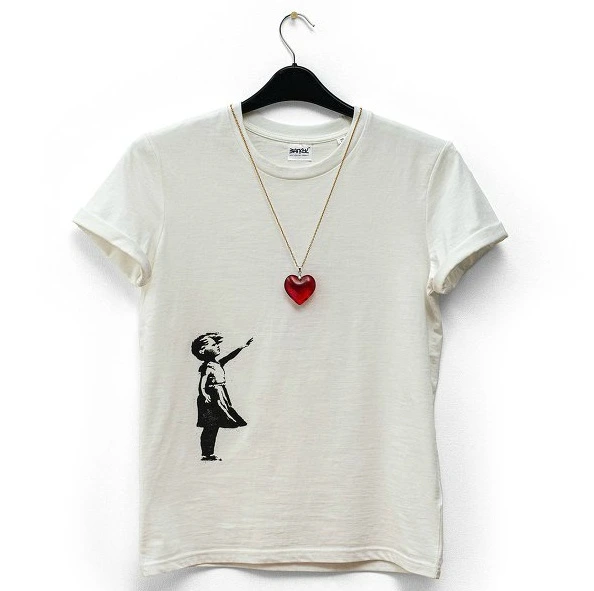 15년 동안 가품으로 제작되던 뱅크시 티셔츠가 드디어 정품으로 출시되었습니다. 뱅크시의 아주 유명한 그림 <풍선과 소녀>를 모티브로 만들어졌는데요. 풍선은 실제 보석으로 이루어졌다고 하네요. 공정무역 티셔츠에 스크린 프린트로 제작되었습니다.