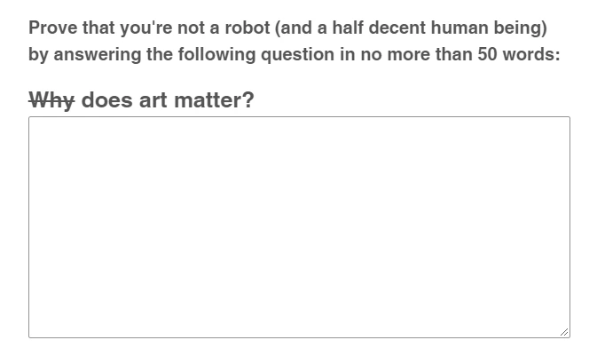 보통 이런 제품이 발매될 때는 선착순으로 돈을 지불하고 살 수 있는데요. 뱅크시의 물건들은 그렇지 않습니다. 먼저 1인당 1개의 상품만 살 수 있습니다. 그리고 구매하기 위해서는 하나의 질문에 50자 이내로 답변해야 합니다.