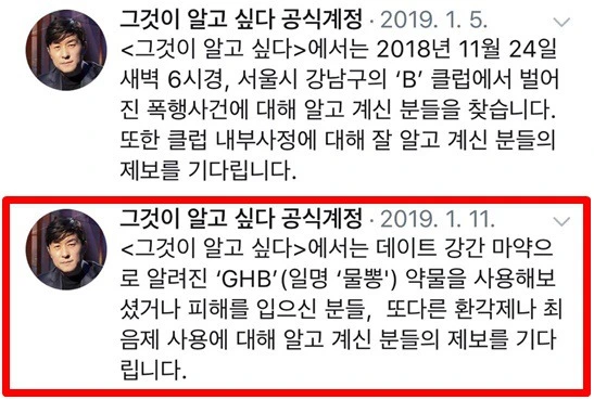 이중 가장 대중들에게 충격을 준 것은 '물뽕'이라는 것이었는데요. SBS의 시사 프로그램 <그것이 알고싶다>에서도 방영되며 큰 논란이 일었습니다.