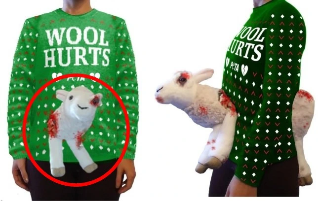 바로 '양모(울)는 양을 아프게 한다'라는 것이었죠. 사실 이 크리스마스 점퍼는 동물의 권리를 보호하기 위한 세계적인 동물보호단체 'PETA'에서 제작한 것이었는데요. 양모는 단순히 양의 털을 깎아 만들기에 동물 학대와는 연관이 없다는 사람들의 인식을 바꾸기 위해 제작한 것이었습니다.
