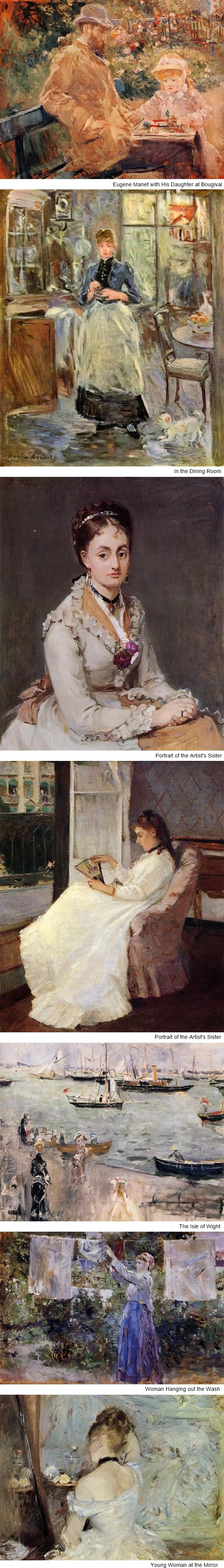 빛을 중시여기는 인상파들은 주로 야외에서 작업했으며 풍경, 야외의 모습 등을 주로 그렸습니다. 그러나 모리조는 여성이라는 이유로 외부에서 자유롭게 그림을 그릴 수 없어 주류 인상파들과는 다른 소재를 그림으로 남겼습니다. 모리조는 실내의 정적인 모습, 가정부, 요리사, 보모, 주부 등 일하는 여성, 그리고 상류층 부르주아 여성들의 모습을 따뜻하고 온화한 분위기로 담아냈습니다. 모리조의 그림 몇 점을 함께 보겠습니다.