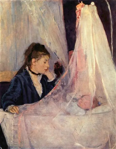 '요람'은 베르트 모리조가 그린 작품 중 최고로 꼽히는 작품입니다. 그림 속에서 아기를 내려다보고 있는 주인공은 모리조의 언니이자 어렸을 때는 함께 그림을 그렸던 에드마입니다. 계속해서 꿈을 찾아갔던 모리조와 달리 언니 에드마는 결혼을 하면서 그림을 그릴 수 없게 되었습니다. 그런 언니를 위해 모리조는 언니와 아기가 함께 있는 모습을 그림으로 남겨주기로 마음먹고 이 그림을 그리게 되었습니다. 그림속의 에드마는 아기를 사랑스러운 눈빛으로 온화하게 바라보고 있으며 이 그림의 주제는 모성과 가족이라고 말하는 사람들이 있는 반면 꿈을 포기해야만 했던 언니의 처지를 애처롭게 바라보는 모리조의 시선이 그림 속 에드마의 표정에 반영되었다는 평가도 있습니다.