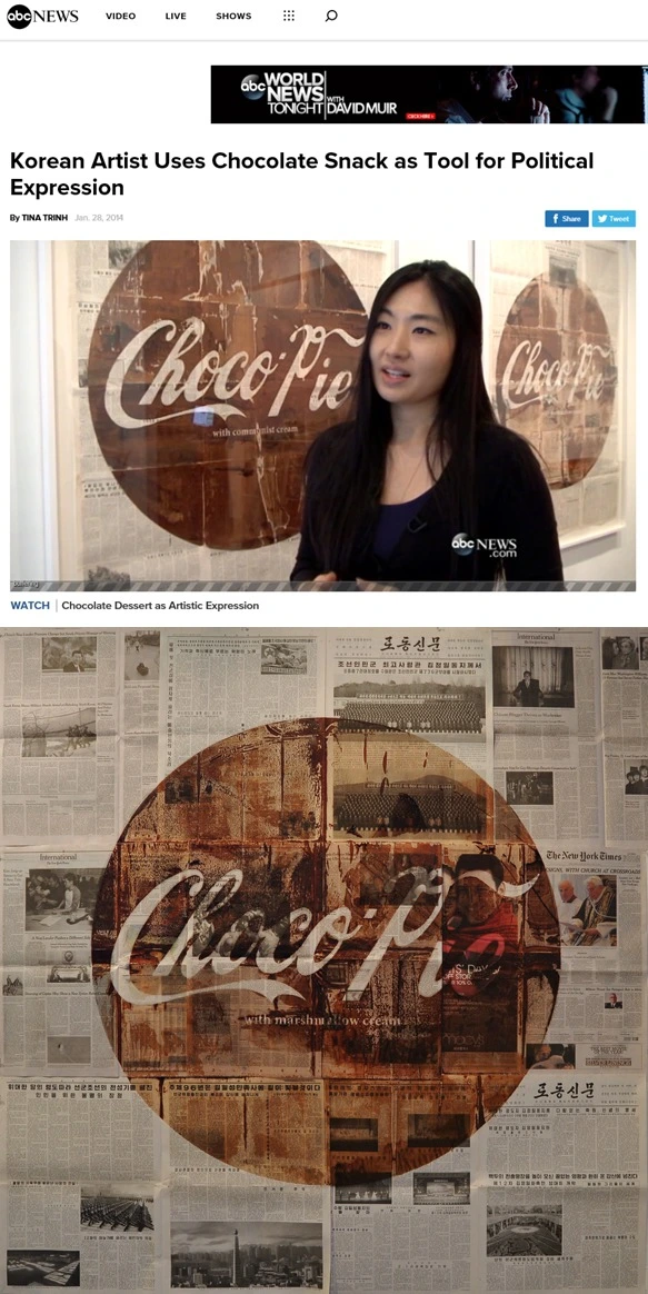 이 작가는 북한 노동당 기관지 노동신문과 초코파이를 소재로 작품을 만들어 화제를 모았던 이 작가는 특이하게도 물감을 사용하지 않고 초콜릿을 사용하여 작품을 완성했습니다. 북한을 상징하는 노동신문, 북한에서 일종의 화폐 구실을 하고 있지만, 한국에서는 단돈 25센트에 살 수 있는 값싼 간식인 초코파이의 상징성을 이용하여 작업이 되었으며, 작가는 한국인으로서 북한에서 어떤 일이 벌어지는지 관심을 가져야 한다는 일종의 책임 의식도 갖게 되었다고 밝힙니다. 남북관계가 화해 분위기로 바뀌고 있는 지금 더욱더 주목받는 작가입니다.