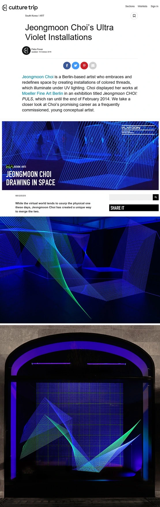 이 작가는 오직 실과 빛으로만 공간을 채워놓은 작품을 제작합니다. 때로는 평면으로, 때로는 공간 전체를 활용하여 설치되는 작품을 감상하는 관람자들은 몽환적인 시각 요소와 오디오를 통해 특별한 경험을 할 수 있습니다. 실은 매우 얇고 섬세하며 끊어지기 쉬운 소재이지만 작가의 작품 안에서 이 실은 공간을 압도하며 탄탄한 안정감을 자아내고 있어 이로부터 나오는 안정과 불안정은 작품에 긴장감을 자아냅니다.
