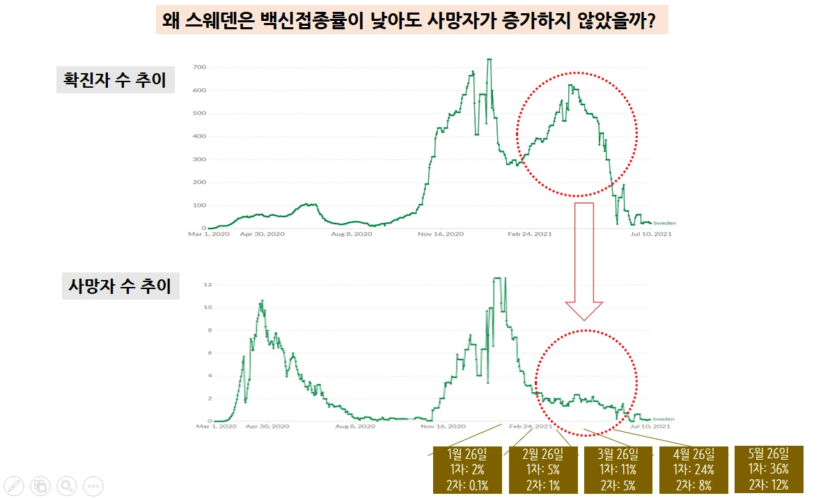 다시 스웨덴 사례를 보겠습니다. 아래 그래프에서 보듯 스웨덴의 경우 2월 말경부터 확진자가 급증하기 시작했는데 그럼에도 불구하고 여전히 사망자 증가를 보이지 않았습니다. 그 시기 스웨덴의 백신 접종률은 1차 10~20%, 2차 5~10% 정도에 불과했고요. 현재 우리나라보다 낮은 백신 접종률이었지만 영국과 비슷한 패턴을 보이고 있죠. 즉, 확진자가 증가해도 사망자가 늘어나지 않는 현상은 바이러스의 치명률은 낮아지고 숙주의 면역력은 높아지는 공진화, 그리고 고위험군에만 집중하는 백신 접종으로 얼마든지 가능합니다. 그리고 영국의 경우 시기상 계절성 요인도 중요한 역할을 했을 것이고요.