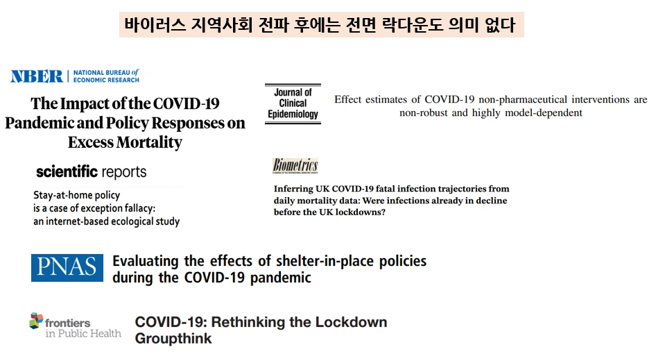 최근 가장 강력한 사회적 거리두기의 형태인 전면 락다운조차 별 의미가 없었다는 연구결과들이 줄지어 나오고 있지만 우리 사회에서는 아직도 방역 신화에 사로잡힌 사람들이 대부분인 듯합니다. “바이러스 지역사회 전파 후” 전체 사회를 대상으로 한 사회적 거리두기란 단지 일시적으로 효과가 있는 것처럼 보이는 착시현상일 뿐입니다. 사람들 간의 접촉이 시작되면 다시 바이러스는 제 갈길을 가기 시작합니다. 거리두기의 강도가 강하면 강할수록 그 효과는 더욱 단기적이고, 대신 전체 사회가 치뤄야 할 유무형의 대가는 장기적이며 파괴적이죠.