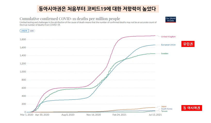 유럽과 미국에서 수만 명의 관중들이 노 마스크로 운집한 스포츠 경기장을 보면서 많은 사람들이 우리나라도 백신 접종률만 높이면 곧 그런 미래가 찾아올 것이라는 환상을 가지는 것 같습니다. 하지만 백신 접종률이 100%가 되어도 지금처럼 역학조사에 기반하여 확진자수를 헤아리는 방역 정책을 고수하는 한 그런 날은 결코 오지 않습니다. 유행 초기부터 코비드 19에 대한 높은 저항력을 보였던 동아시아권에서 확진자 동선을 추적하고 무증상자를 격리하는 방역정책을 지금까지 유지하면서 의미 없는 확진자수에 전 국민을 울고 웃게 만든 것은 사실 난센스에 가깝습니다. K방역 덕분에 이 정도로 유지하고 있을 뿐이라고 주장하고 싶은 분들은, 작년 5월까지 4일 이상 고열이라는 거의 폐렴에 준하는 증상이 있어야만 PCR 검사를 해주었던 일본의 코비드19 누적 사망률을 아래 그래프에서 확인해보시기 바랍니다. 비유하자면 우리는 빙하기가 오지도 않았는데 자진해서 설국열차에 올라탄 승객들입니다.