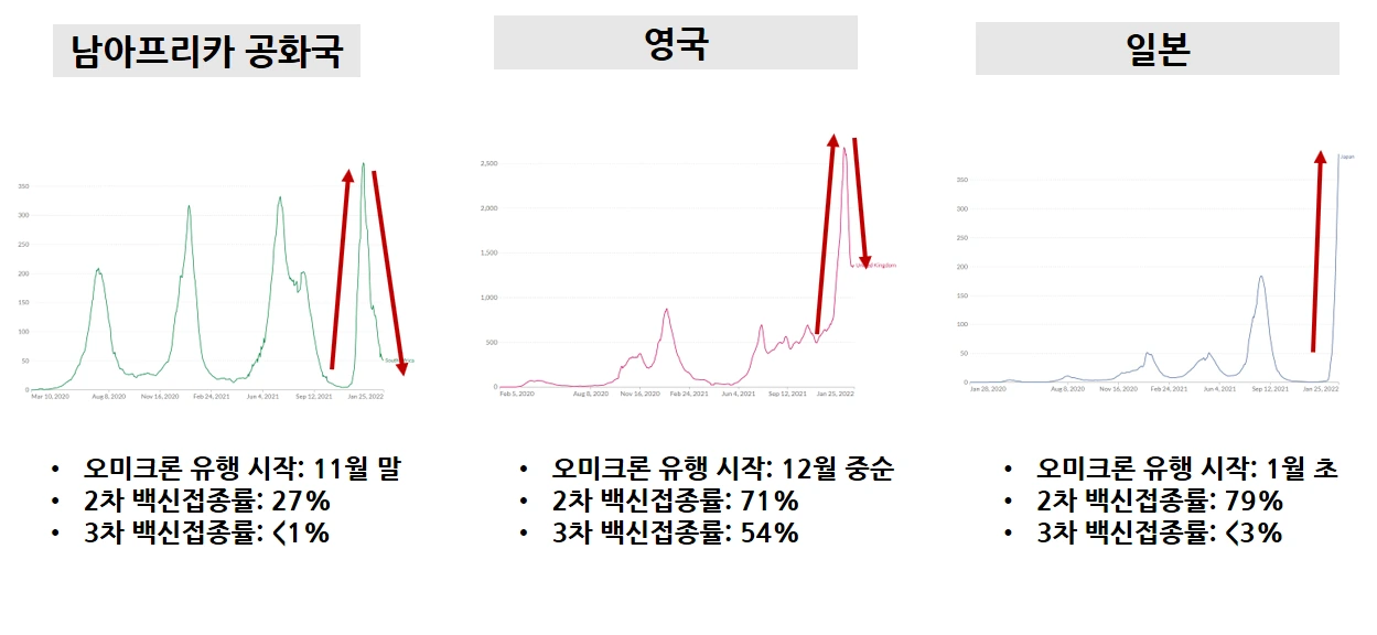 남아프리카 공화국은 백신 접종률이 매우 낮은데도 불구하고, 2달 정도에 걸쳐 확진자 급증 후 급감을 깨끗하게 보여줍니다. 영국은 급감 와중에 일시적으로 주춤하는 패턴을 보이고 있는데, 좀 더 지켜볼 필요가 있을 듯 하고요. 일본도 좀 더 많은 사람들이 감염되고 나면 머지 않아 지난여름 보인 것과 같은 확진자 급감이 다시 나타날 것으로 예상합니다. 부스터 샷 접종률이 매우 낮다는 점이 우리나라에게 꽤나 흥미로운 지점이 될 거고요.