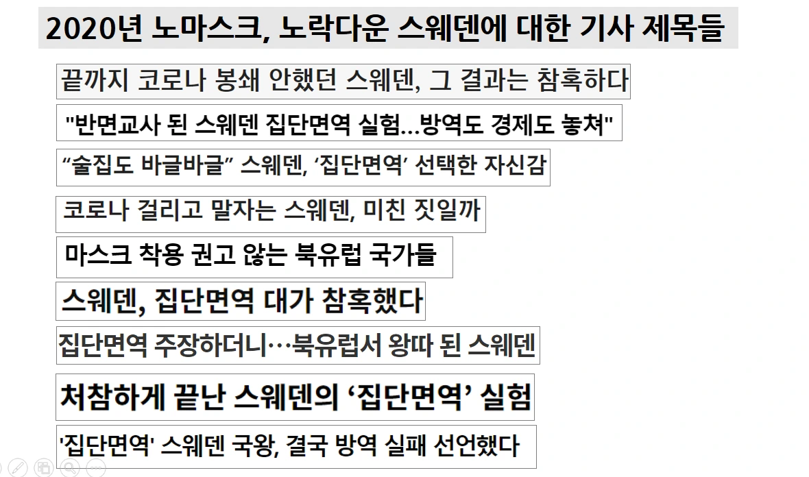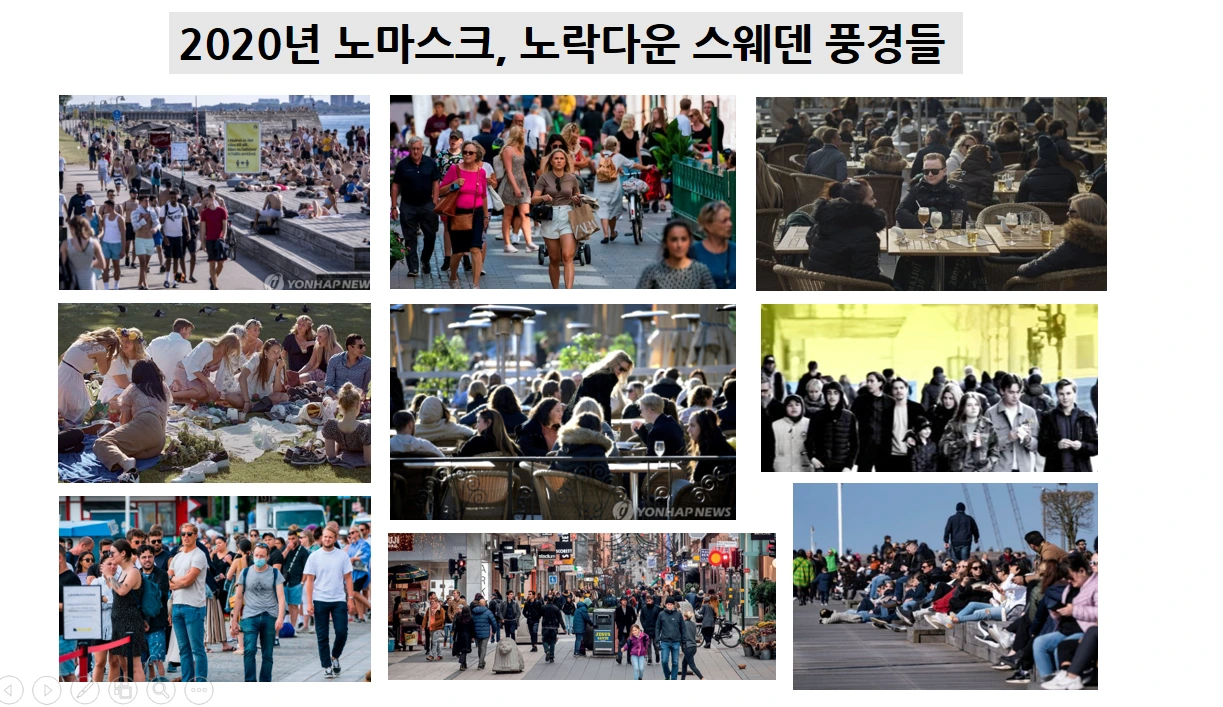 아래는 실내에서조차 노마스크로 대응했던 스웨덴의 2020년 풍경과 당시 기사 제목들입니다. 마스크도 하지 않은 채 아이들은 유치원과 학교를 다니고 쇼핑몰, 지하철, 레스토랑, 술집 어디서나 마스크 쓴 사람 찾기가 더 어려웠던 스웨덴.. 우리나라 기준으로 본다면 이미 스웨덴은 지구 상에서 사라졌어야 할 국가가 아니던가요? 그러나 스웨덴은 유행 시작부터 지금까지 예전과 크게 다를 바 없는 일상을 이어가고 있을 뿐입니다.