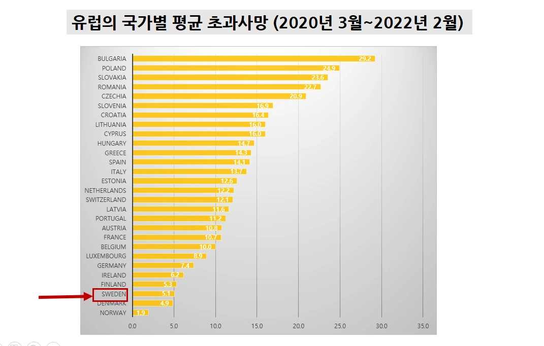 한국의 초과사망, 집단면역의 스웨덴보다 더 높다 (2022년 8월 14일)