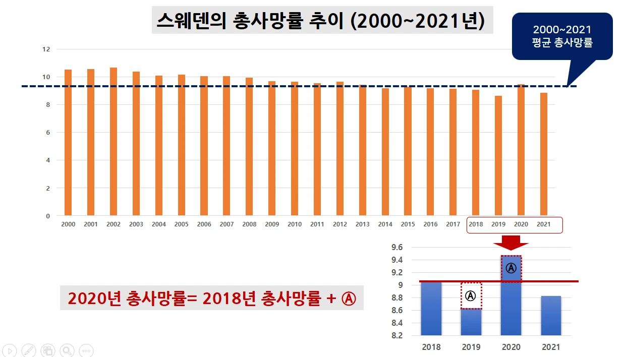 아래 그래프는 스웨덴 통계청 자료에 기반한 지난 20년간 스웨덴의 인구 천명당 총 사망률 추이입니다. 코비드 19 유행이 있었던 2020년과 2021년 총사망률이 예전과 별 차이가 없었다는 사실을 알 수 있죠. 지금까지 스웨덴의 코비드 19 사망자수가 1만 9천여 명에 이릅니다만 이런 결과가 가능한 이유는 앞서 여러 번 설명드린 사망률 치환 현상 때문입니다. 즉 코비드 19 유행이 없었더라면 비슷한 시기 다른 감염병이나 질병으로 사망할 고령의 기저질환자들이 코비드 19로 사망하는 일이 광범위하게 발생했기 때문입니다. 또한 스웨덴은 2019년 총사망률이 예외적으로 낮았다는 점이 2020년 코비드 19 유행에 직접적으로 영향을 미치는 주요 사건이 됩니다. 따라서 아래 그림처럼 2018년을 기준으로 보면, 2019년 총사망률이 감소한 Ⓐ만큼 2020년 총사망률이 증가했음을 알 수 있습니다.