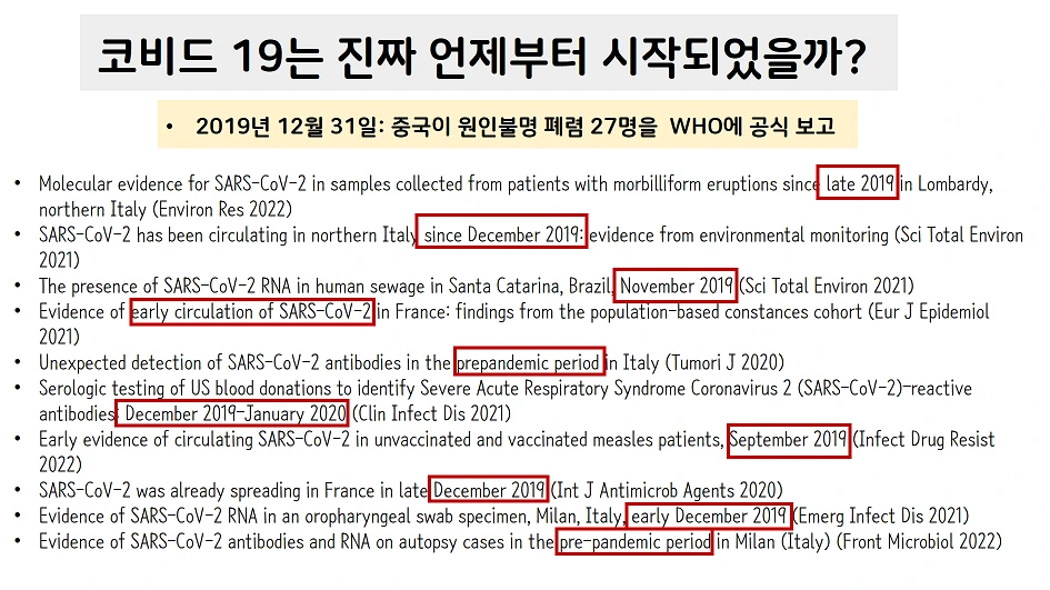코비드 19가 공식적으로 시작된 날짜는 2019년 12월 말입니다. 그러나 무증상과 경한 증상이 많고 전파 속도가 빠른 바이러스 특성상 공식 보고 날짜 훨씬 전부터 유행이 시작되었다고 봐야 합니다. 실제로 2019년 가을에 수집된 각종 인체 시료와 환경 시료 분석에서 일찍부터 코비드 19 전파가 시작되었음을 시사하는 많은 연구결과들이 존재하죠.