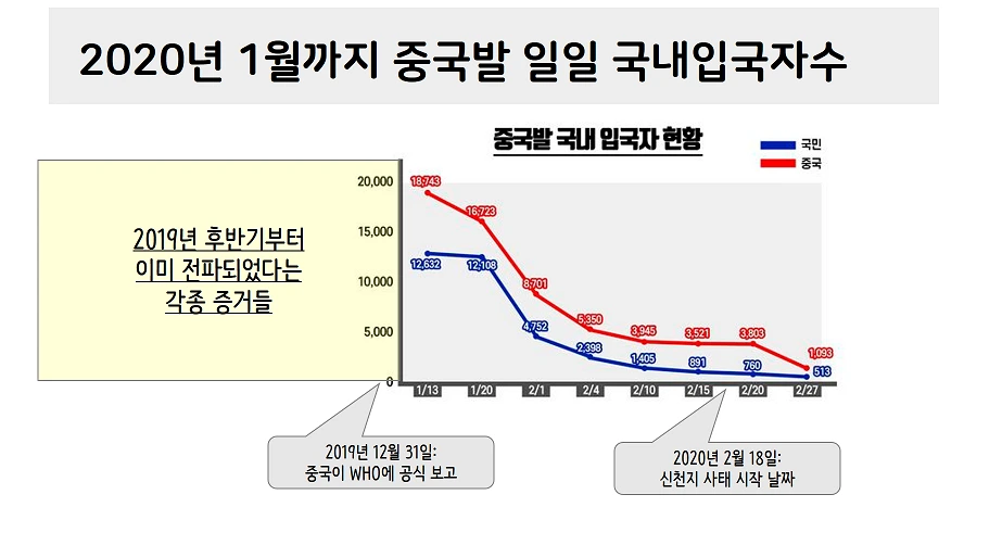 코비드 19 유행전, 평소 중국에서 한국으로 들어오는 입국자수가 하루 수만 명, 한 달이면 백만 명이 넘었습니다. 그리고 이 추세는 유행 인지 후인 2020년 1월 말까지 계속되었죠. 그런 상황에서 갑자기 특정 인물, 특정 집단을 유행의 주범으로 몰아서 마녀사냥을 벌이면서 전 세계가 감탄하는 K방역으로 국민을 세뇌시킨 국가가 대한민국입니다. 3년 동안 제로 코로나 정책을 두고 인민의 승리로 포장해 왔던 중국과 과연 무엇이 다른가요?