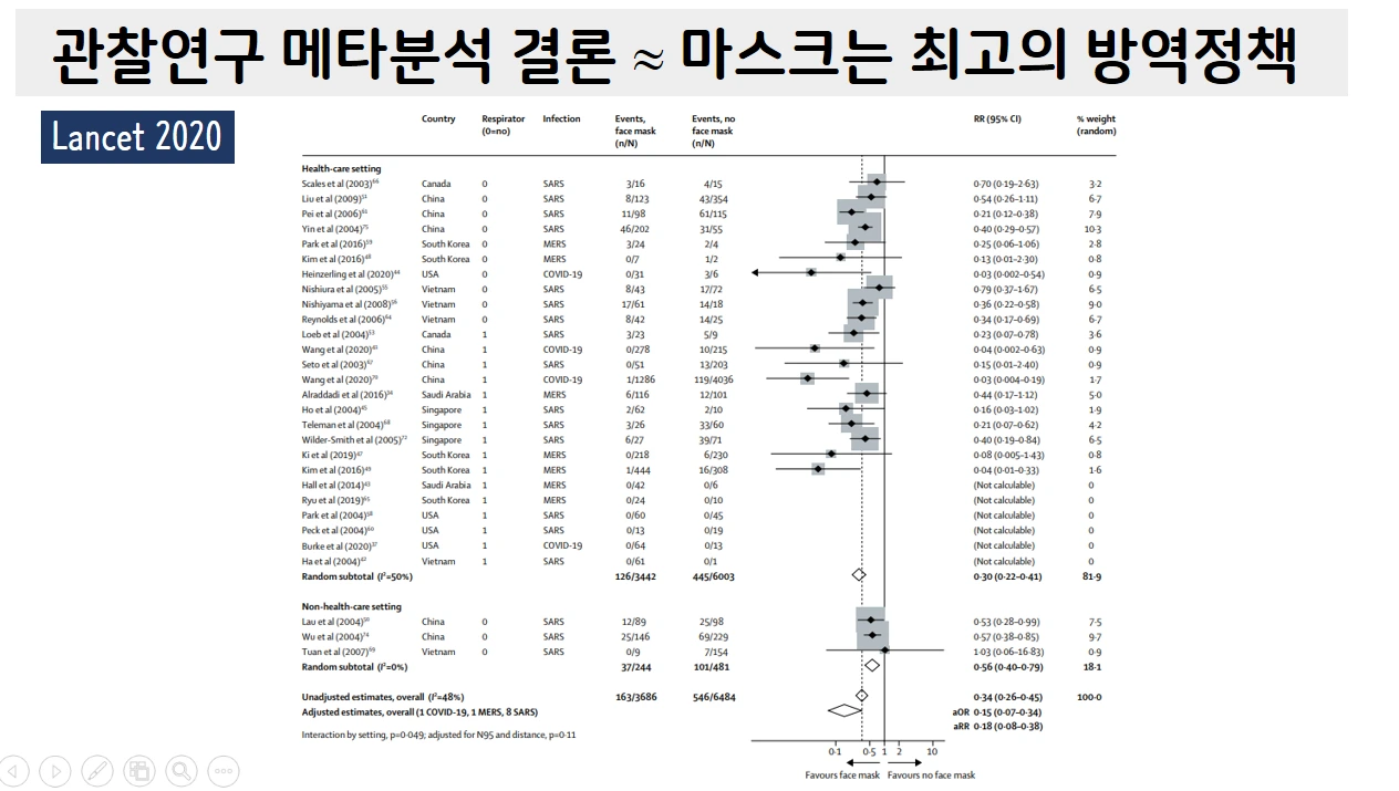 한편 유행초기였던 2020년 6월, 비슷한 목적을 가지고 시행된 메타분석 논문이 Lancet이라는 빅저널에 실린 바 있습니다. 이번에 발표된 메타분석과는 정반대로, Lancet 논문의 결론은 거리두기, 마스크, 보안경 등 모든 방역정책들이 매우 효과적이며, 그중에서도 마스크는 타의 추종을 불허할 만큼 효과적이라는 것이었죠. 그리고 이 논문은 마스크 의무화제도를 시행하는 과학적 근거로 널리 인용되곤 했고, "질병청 제작 마스크 효과 한방 정리 시청소감"에 적었듯 우리나라 마스크 홍보 동영상에도 핵심 근거로 포함되어 있습니다.