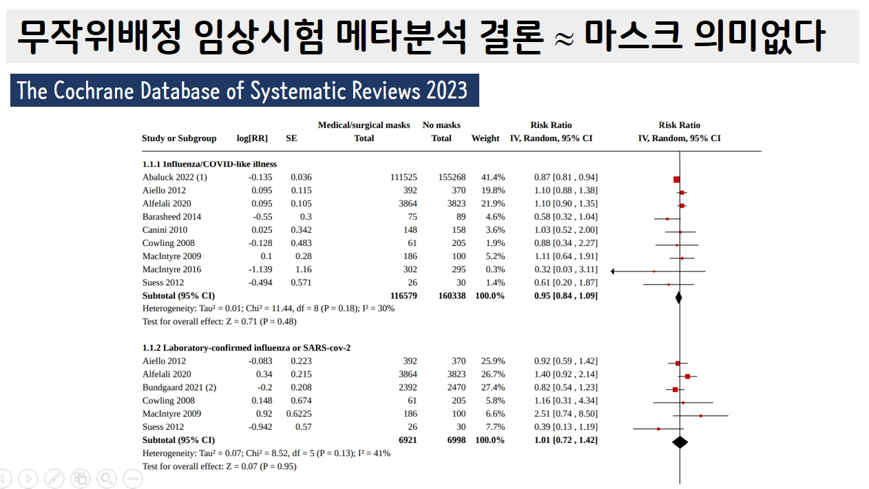 즉, 지역 사회에서 사용하는 마스크는 독감이나 코비드 19와 같은 바이러스 전파를 막는데 별 의미가 없었다는 결론으로 아래 그림은 논문에 포함된 메타분석 결과입니다. 물론 저자들은 마스크와 같이 사람 행동에 기반한 개입은 비록 무작위배정 임상시험이라 하더라도 한계가 있음을 지적하고 있습니다만, 그렇기 때문에 실험실에서 마네킹을 대상으로 한 연구가 아닌 현실의 사람들을 대상으로 하는 무작위배정 임상시험이 더욱 중요합니다.